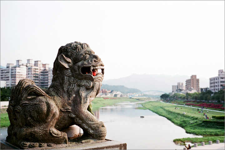 石獅矗立於橋邊欄杆上 .