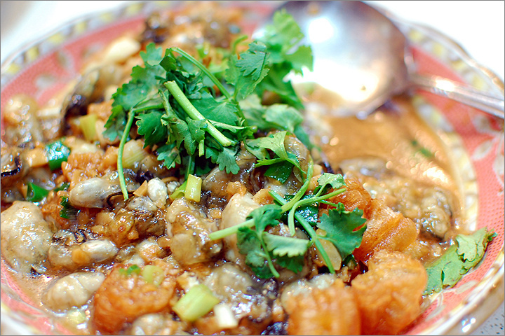 蚵仔配炸油條 , 第 1 次吃到這道菜 .