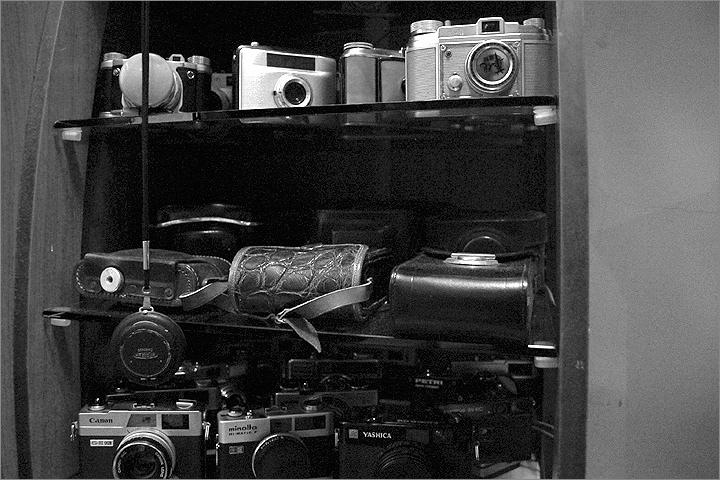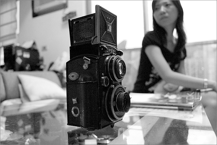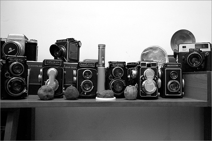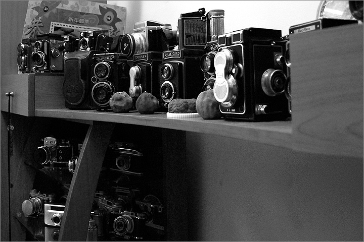 老魚相機舖隱身於民宅之中 , 連客廳的電視架上都擺滿了各種廠牌的 ( TLR ) 相機 .